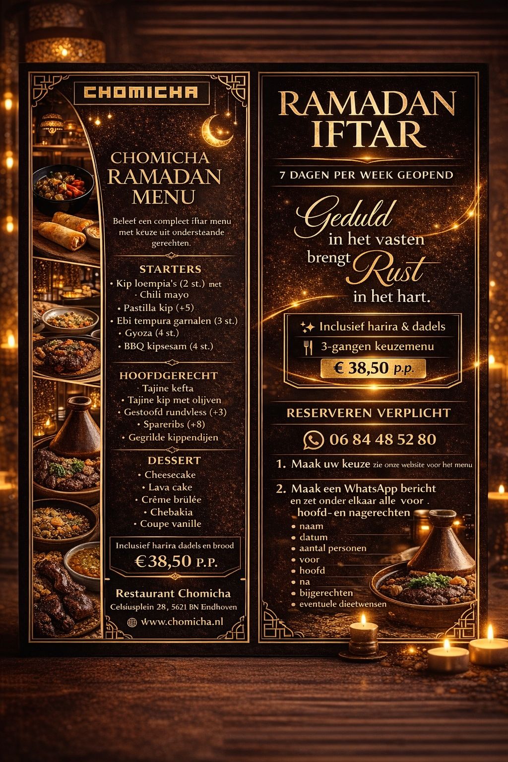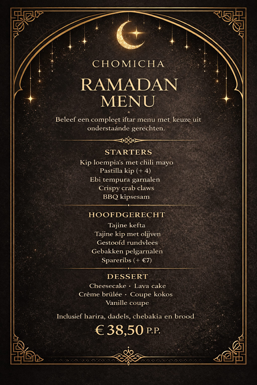Restaurant Chomicha, Dit restaurant is genaamd naar mijn moeder die mij door de jaren heen al de fijne kneepjes van deze fantastische keuken geleerd heeft. Marokkaanse fusion is een unieke mix van professionele benadering en de combinatie van culinaire tradities om zo de beste smaakbeleving te kunnen waarnemen. Al ruim 17 jaar een begrip in Eindhoven, inmiddels 8 jaar midden in de hippe woonwijk genaamd Woensel west op Celsiusplein 28.